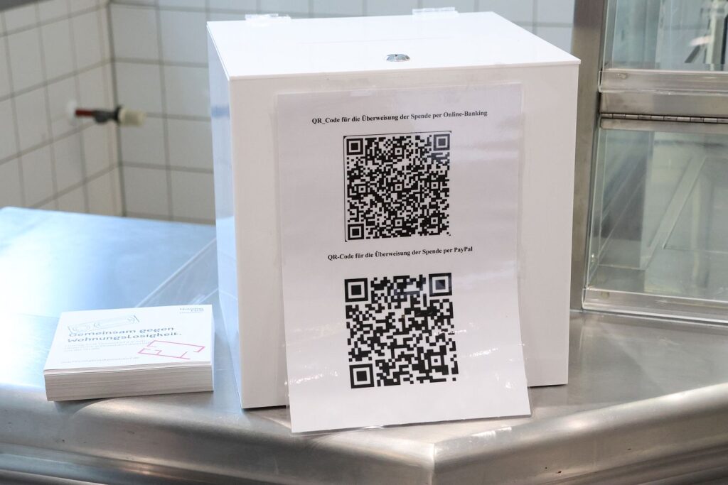 Die Bilanz nach fünf Wochen ist bestens, bis zu 180 Essen wurde in der Spitze ausgegeben, im Schnitt waren es 100 bis 150. Die Qualität des Essen hat sich auch schon im gegenüberliegenden Polizeipräsidium herumgesprochen, deren Mitarbeitenden ebenfalls die Kantine besuchen können (der Besuch ist nur mit Dienstausweis möglich). Beim Essen gibt es keinen vorgegebenen Preis, an der Kasse steht nur eine weiße Box mit QR-Code. Denn jeder kann selber bestimmen, was das Essen wert ist und entsprechend Bargeld einwerfen oder über Banking App oder Paypal bezahlen. Ziel ist es, dass sich das Projekt selber trägt.