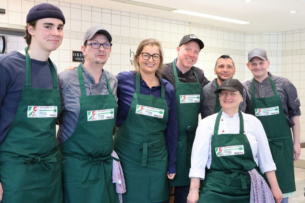 Das Ministerium für Arbeit, Gesundheit und Soziales NRW (MAGS) am Fürstenwall hat eine Kantine, aber keinen Betreiber. Der Verein Housing First Düsseldorf widmet sich, neben der Vermittlung von Wohnraum, in der zweiten Stufe der Integration der ehemals Obdachlosen in den Arbeitsmarkt – mit Schwerpunkt Küche und Gastronomie. Da haben sich zwei gefunden, könnte man sagen. Denn seit fünf Wochen läuft das Projekt „Housing First meets MAGS“ und die Begeisterung ist auf beiden Seiten groß: Die Beschäftigten freuen sich über das leckere Essen und das Team von Housing First fasst auf dem Arbeitsmarkt Fuß.