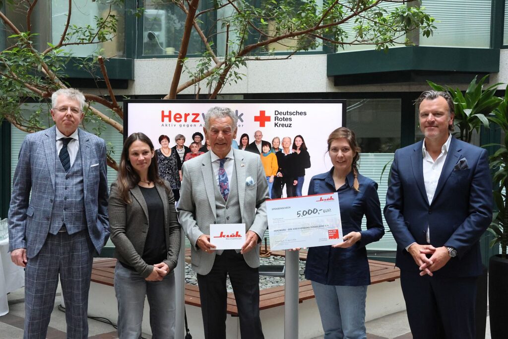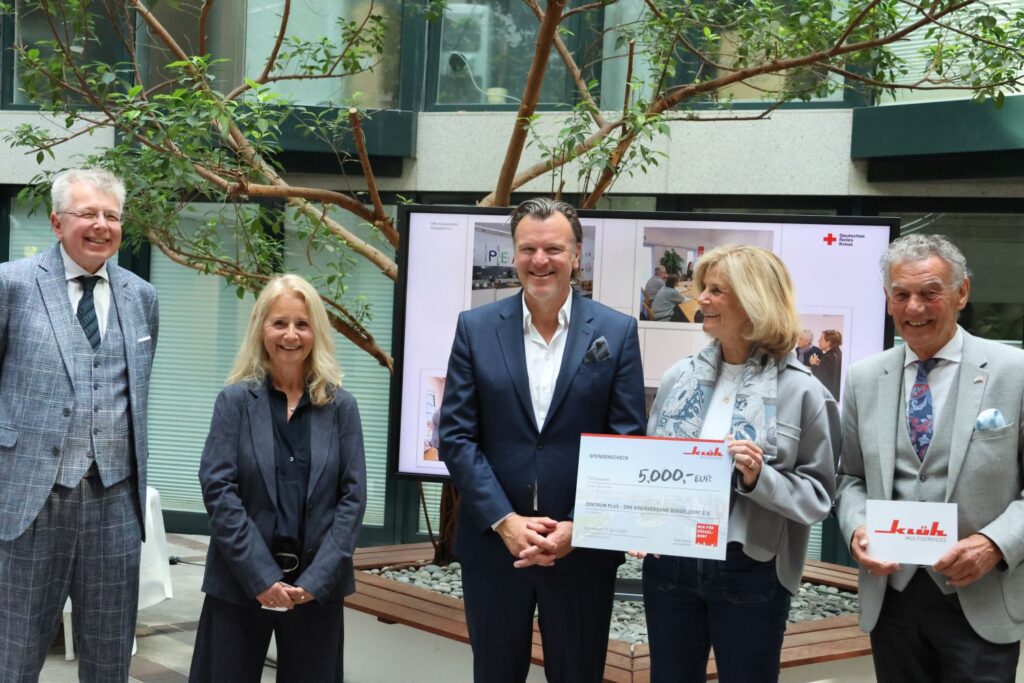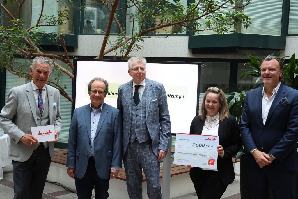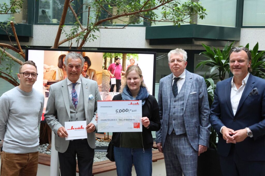In die Firmenzentrale am Wehrhahn hatte das Unternehmen Klüh am Freitag (17.4.) Vertreter*innen von hallo nachbar! – ein Projekt von vision:teilen, der Franzfreunde, des Herzwerks, des DRK-Projekts Aktiv im Ruhestand und des Vereins Sportclub Düsseldorf eingeladen. Sie hatten sich mit ihren Projekten um die Spenden beworben und waren von der Jury – bestehend aus Josef Klüh, Ahlem Sehili-Klüh und Wolfgang Rolshoven – ausgewählt worden.