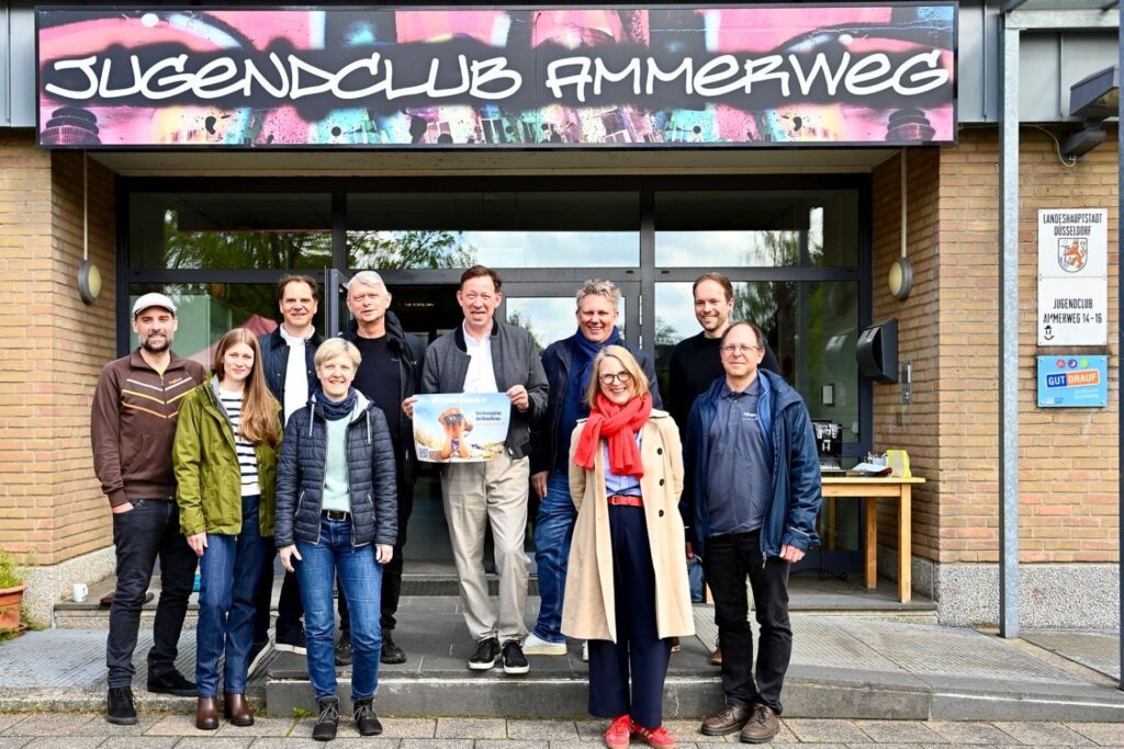(v.l.) Benedigt Hoga (Leiter JFE Ammerweg), Julia Osenberg (Amt für Soziales und Jugend), Rainer Klaeren (Stadtsportbund), Stefanie Kaule (katholische Jugendagentur), Achim Radau-Krüger (Jugendring), Stadtdirektor Burkhard Hintzsche, Oliver Boedrig (Evangelisches Jugendreferat), Maren Siegel und Eric Ebert (Amt für Soziales und Jugend) sowie Marcus Königs (Flingern mobil) stellten das Programm der Düsselferien 2026 vor