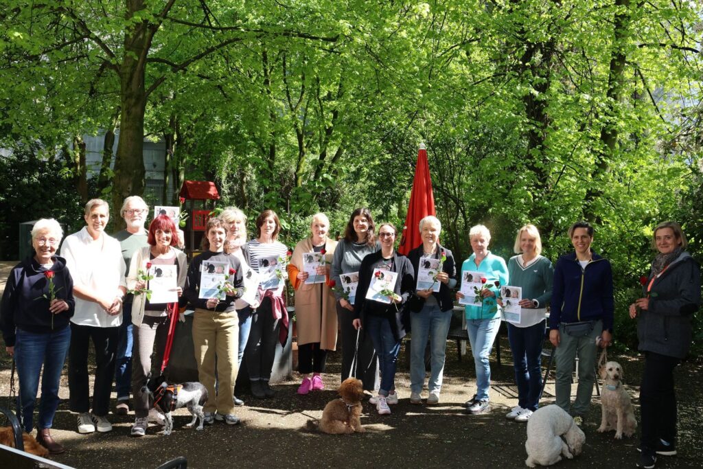 Im Zentrum plus der AWO an der Siegstraße erhielten am Sonntag (19.4.) zwölf neu ausgebildete Ehrenamtliche gemeinsam mit ihren Hunden ihre Zertifikate. Denn wer sich ehrenamtlich mit seinem Hund engagieren möchte, muss eine umfangreiche Ausbildung durchlaufen. Interessierte hatte die Düsseldorfer Projektkoordinatorin Katrin Meyer zum Jahreswechsel aufgerufen, sich zu melden und die Resonanz war mit 28 Hundebesitzer*innen gut. Alle wurden dann zuerst zu einem sogenannten „Casting auf der Hundewiese“ eingeladen. Dort gab es neben weiteren Informationen für die Menschen, auch ein Blick auf den Trainingszustand der Hunde. Denn eine gute Erziehung ist Voraussetzung, da beim Besuch der an Demenz erkrankten Menschen, die Tiere aufs Wort hören müssen, damit beide Seiten sich wohlfühlen.