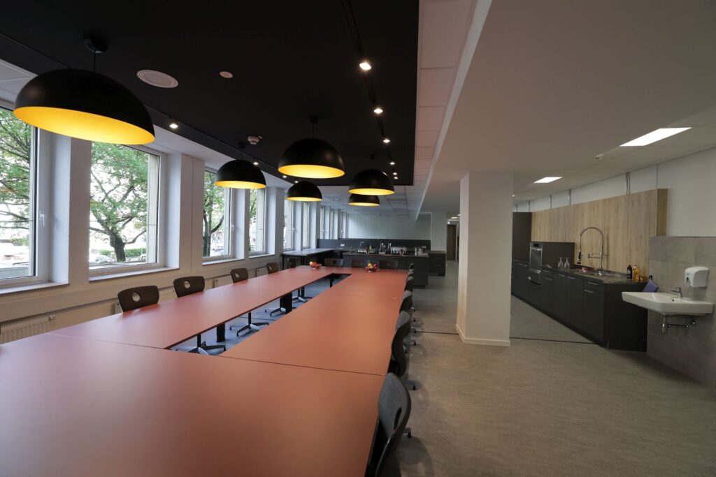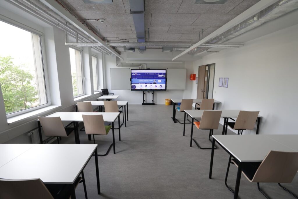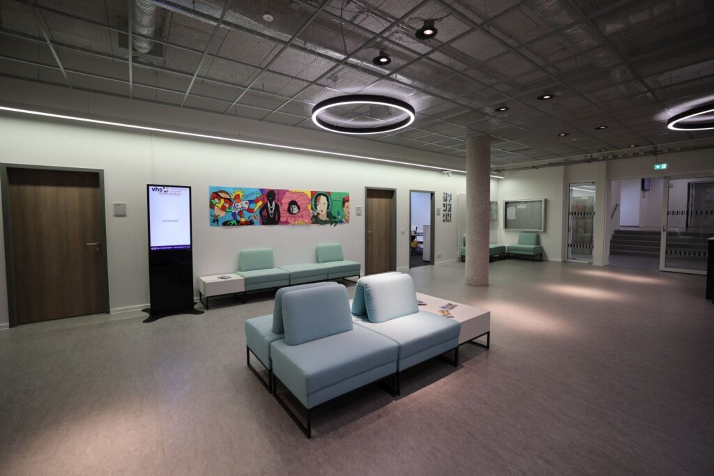 Das Gebäude besteht aus drei Häusern, die mit den Buchstaben „V“, „H“ und „S“ benannt wurden. Ein analoges Leitsystem, kombiniert mit digitalen, tagesaktuellen Raumangaben, führt die Teilnehmenden und Dozierenden schnell zum gewünschten Ziel. Auf allen Etagen entstanden außerdem komfortable Multifunktionsflächen, die zum Selbststudium genutzt werden können.