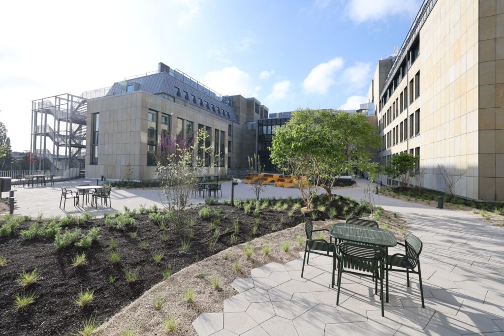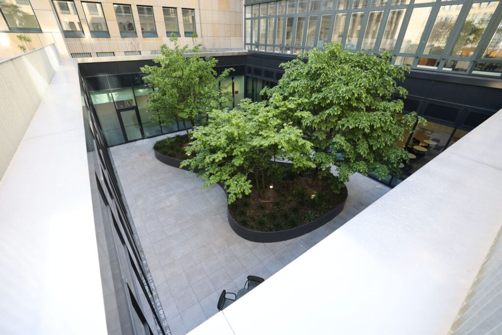 Dazu besteht auch auf den beiden Dachgärten Gelegenheit, die eine Gesamtfläche von über 1.500 Quadratmetern haben. Sie sind mit trockenresistenten und insektenfreundlichen Pflanzen bestückt worden. Im südlichen Innenhof ist teilweise essbares Obst und Gemüse gepflanzt, während im nördlichen Innenhof überwiegend mediterrane und attraktiv blühende Pflanzen eingesetzt wurden.