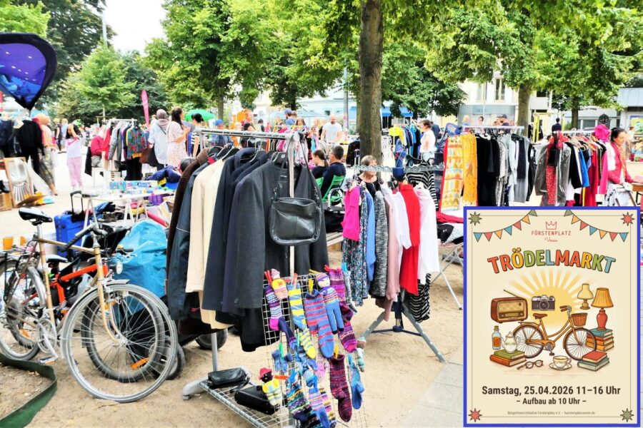 Organisiert wird der Trödelmarkt vom Fürstenplatzverein. Dieser wird auch wieder das Café öffnen und dort Kaffee, Tee, Kuchen und Herzhaftes anbieten. Dabei kann gerne die eigene Tasse mitgebracht werden – das ist für den Verein praktisch und auch umweltfreundlich.