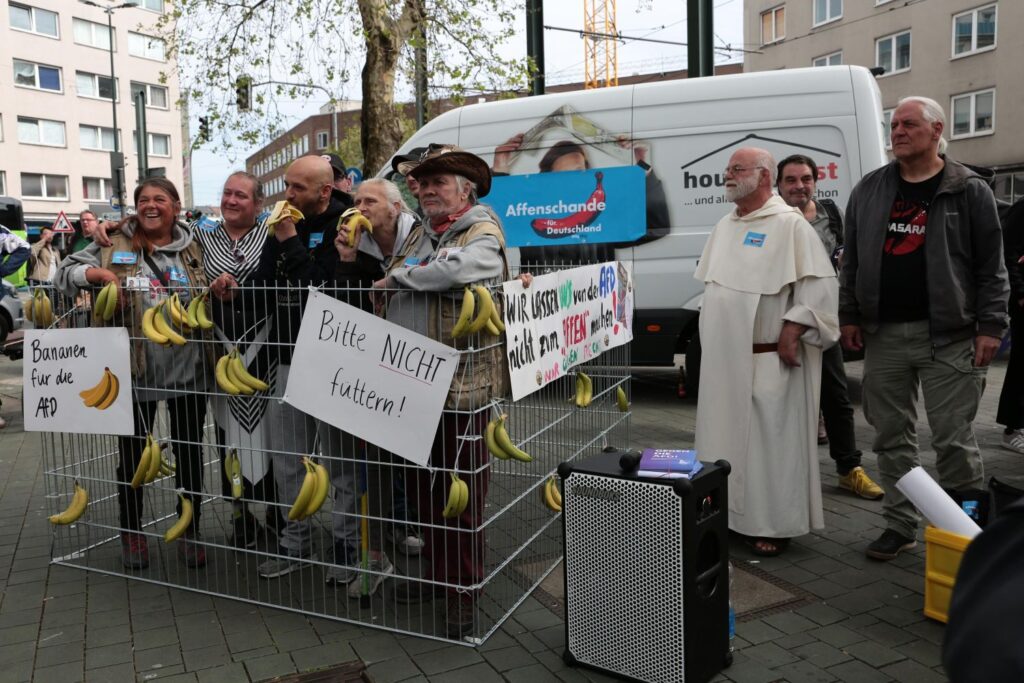 Auf dem Worringerplatz, wo der AfD-Spaziergang starten sollte, hatten sich Hunderte Demonstrierende versammelt, darunter auch Anwohner*innen. Einige ehemalige Obdachlose und Suchtkranke erwarteten die Gäste der blauen Partei in einem Käfig, an dem Bananen befestigt waren. Unter dem Motto „Bananen für die AfD – Düsseldorf ist kein Armutszoo“ protestierten die fiftyfifty-Verkäufer in dem Freiluftgehege. „Wir freuen uns, dass gerade ostdeutsche Politiker sich für Armut in Düsseldorf interessieren. Wir bringen extra auch Bananen mit. Wir weisen aber darauf hin, dass die Menschen im Freiluftgehege nicht gefüttert werden dürfen“, erklärte Oliver Ongaro vom Straßenmagazin fiffyfifty.