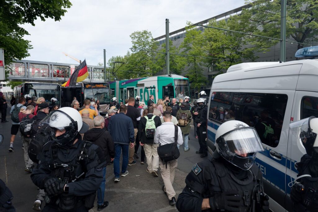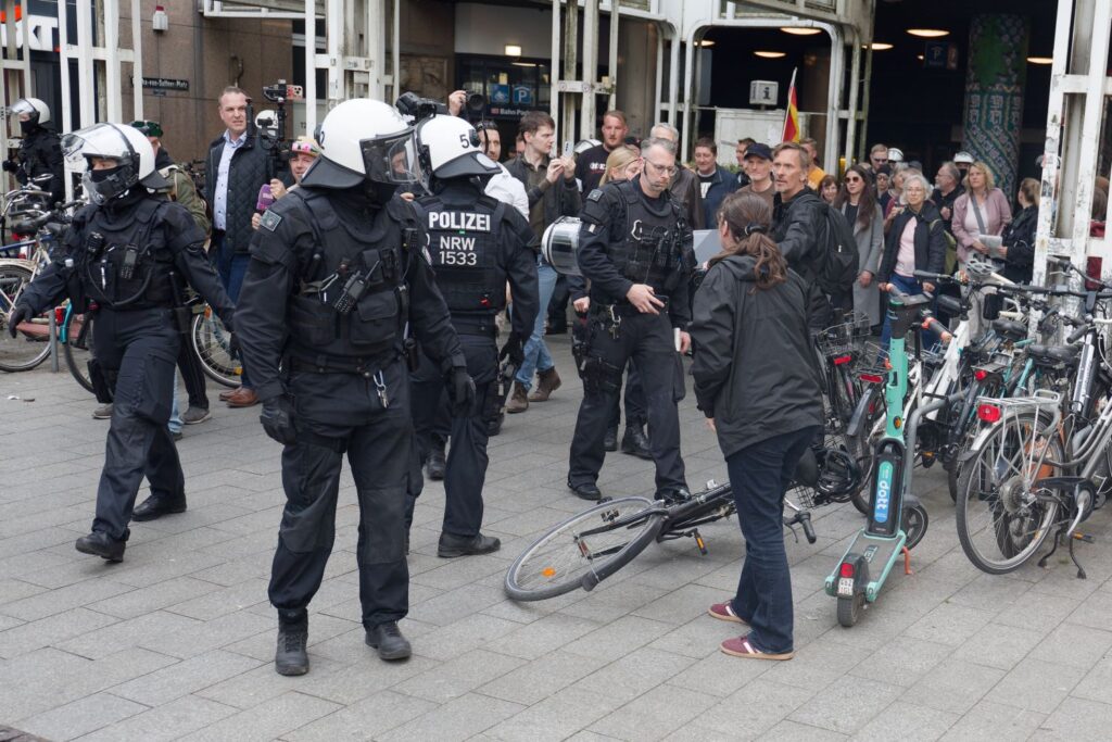Die Gegendemonstrierenden verlegten sich anschließend an die Bachstraße vor die Düsseldorf Arcaden. Dort hatte die AfD in den Bachsaal eingeladen, wo Lena Kotré über ihre politische Arbeit berichten und auch Aspekte zur Remigration ausführen wollte. Wie bereits bei vorherigen AfD-Veranstaltungen wurde erneut von mehren Hundert Menschen gegen die Partei demonstriert.