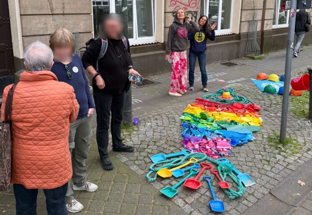 Aber auch dort waren die Demonstrierenden mittlerweile angekommen und zeigten lautstark, was sie von der AfD hielten. Bis zum Regenbogen-Plastikfisch, der von Plasticfisherman Germany, Uruguay! und Bernadette Niehaus vor dem Gebäude an der Eisenstraße vorbereitet worden war, kamen die Spaziergänger gar nicht. Die Stelle war bewusst gewählt, denn an der Eisenstraße plant die Stadt eine neue Anlaufstelle für Drogensüchtige. Von der Willi-Becker-Allee bog die AfD-Gruppe rechts ab, weshalb die Ellerstraße zeitweise gesperrt wurde.