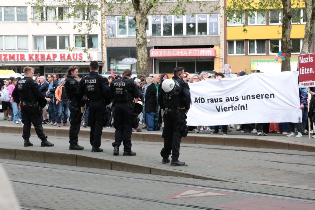 Vom Worringer Platz sollte es über das Kap1 und die Harkotstraße über den Mintropplatz und die Ellerstraße zur Eisenstraße gehen. Doch Auf Höhe der Stadtbibliothek waren die Aktionen des Gegenprotestes von Omas gegen Rechts, dem FFT, dem jungen Schauspielhaus und den Gewerkschaften so groß, dass die AfD-Spazierer*innen kehrt machten. Begleitet von großem Polizeiaufgebot versuchten sie es nun von hinten, das heißt über die Kölner Straße und Ludwig-Erhard-Allee zum Bertha-von-Suttner Platz.